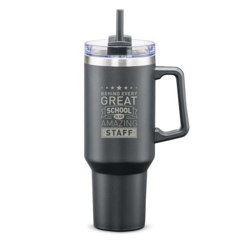 You and your team will love our Personalized Teacher Appreciation Gift 40oz. Stan Stainless Steel Tumbler. Show teachers and staff appreciation in style with the Personalized 40oz. Stainless Steel Tumbler. This sleek and spacious straw tumbler not only keeps beverages at the perfect temperature but also offers a heartfelt message that resonates with gratitude. Available in six vibrant colors, it is an ideal corporate gift that suits any festive occasion. Its durable design, paired with a convenient handle, makes it a practical yet thoughtful gift, perfect for team members or loved ones who deserve recognition for their hard work. Make every sip a reminder of appreciation with this versatile and attractive drinkware piece.