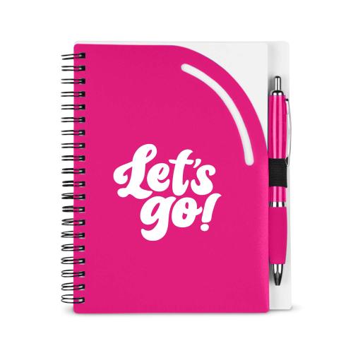 Pair practicality with style and showcase your brand with this eye-catching notebook and pen set. Ideal for team gifts, client appreciation, or event giveaways, this set features a bold front pocket, a durable spiral binding, and a smooth-writing pen. The perfect way to keep your brand visible while offering a useful tool for daily organization. Minimum of 75.