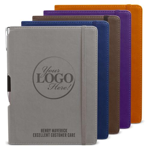 Enhance your note-taking experience with the Logo Helios Journal, tailored for professionals who value both style and function. This journal's elegant, leather-like cover is available in an array of rich colors, ready to be adorned with your unique branding or a personalized engraving. Seamlessly capture your thoughts or meeting notes on its superb quality pages, while keeping organized with its handy back pocket and bookmark. Secure your musings with its elastic band closure and always be prepared with the included stylus pen, conveniently nestled in the spine. This is more than a journal; it's an accessory that speaks to your commitment to excellence.