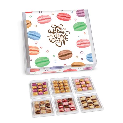 Give the gift of elegance and flavor with our Custom Macaron Gift Sets. Each handcrafted French macaron is made with the finest ingredients, creating a delicate balance of texture and taste that's as beautiful as it is delicious. Ideal for employee appreciation, client thank-yous, or event giveaways, these customizable sets make a lasting impression. Add your logo or personalized message to the box for a branded touch that turns every bite into a sweet celebration of your company's thoughtfulness and creativity.
