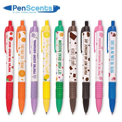 You and your team will love our Appreciation Scented Pens. Create an air of appreciation—literally—with our playful new line of scented pens designed to delight the senses. Made in the USA, these medium point, click-action pens feature a soft comfort grip and come in a variety of nostalgic and mood-boosting scents like Strawberry, Coffee, Buttercream, and more. Since scent is the strongest sense tied to memory and emotion, these pens make everyday writing feel a little more personal and a lot more fun. Available in sets of 4 or grab all 9 in a fragrant variety pack!