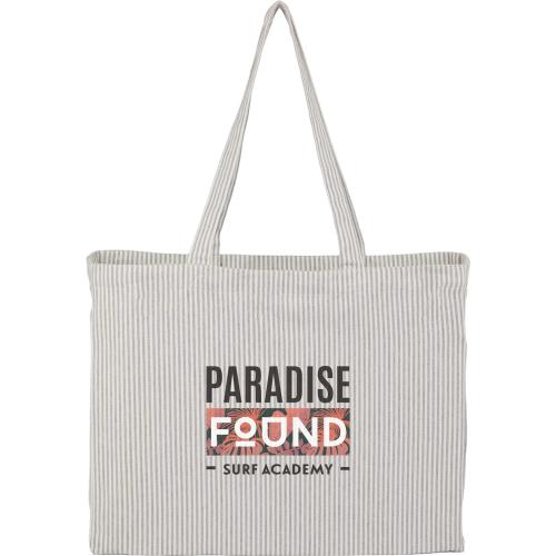 Introducing the EcoWave Stripes Recycled Tote Bag, where sustainability meets style. Crafted from 100% recycled 7oz cotton, this tote embodies an elegant and timeless design with its crisp striped pattern. Whether you're heading to the office, the farmer's market, or a weekend getaway, its spacious open main compartment and comfortable 11-inch drop handles provide convenience and ease for carrying all your essentials. Feel the soft, durable cotton as you make an eco-friendly statement. Plus, with every purchase, you're contributing to a greener planet through our commitment to environmental nonprofits. The EcoWave tote is more than just a bag-it's a testament to conscious living and a thoughtful choice for corporate gifting. Elevate your brand and inspire positive change. Choose the EcoWave Stripes Tote Bag today and carry the future with you.