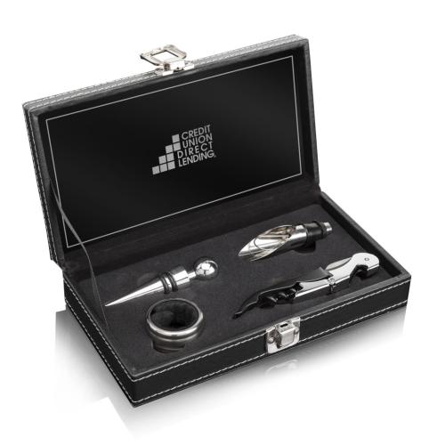 Unleash the art of wine appreciation with the VinoMaster 4pc Lux Wine Gift Set, the ultimate expression of sophistication for the discerning wine enthusiast. Encased in a luxurious leatherette case with an elegant finish, this premium set promises to elevate every uncorking moment into an unforgettable experience. Featuring a precision-crafted sommelier's knife, an indispensable drip-stop ring, a seamless bottle pourer, and a self-sealing stopper, the VinoMaster ensures that your wine is savored, not spilled. Imagine sharing this exquisite gift with clients or partners, transforming ordinary business gestures into lasting impressions. Perfect for corporate events or as an exclusive client gift, let your brand shine with personalized engraving on the sleek metal lid. Make every toast an occasion with the VinoMaster-your gateway to a world of elegant enjoyment. Elevate your corporate gifting by selecting this unparalleled blend of style and function today.