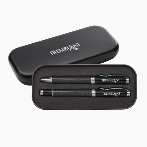 Introducing the Eclipse Black Pen Prestige Set, an embodiment of sophistication and style that transforms writing into a luxurious experience. This exquisite gift set features both a ballpoint and rollerball pen, each adorned with sleek chrome accents that lend a touch of modern elegance. Encased in a refined black gift box, it's the perfect choice for making a lasting impression at corporate events or as a thoughtful gesture for valued clients.