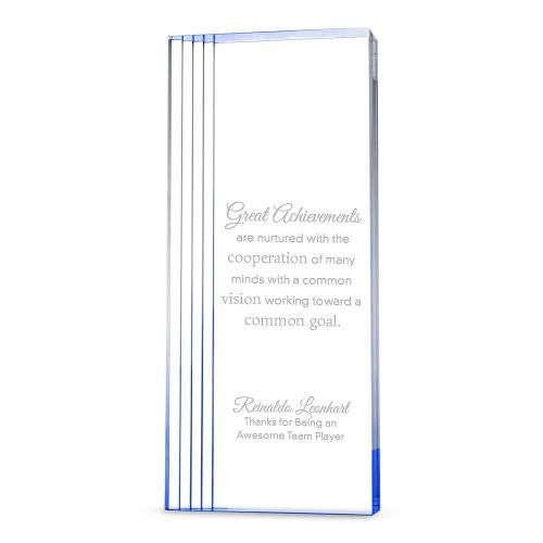 The Stepton Acrylic Award is a sleek, freestanding recognition piece defined by its tall rectangular silhouette and distinctive stepped edge detailing. The layered design along one side adds depth and architectural interest, creating a subtle sense of movement and dimension. Its wide, crystal-clear face provides the perfect canvas for engraving or full-color personalization, while precision-polished acrylic surfaces catch the light for a clean, premium finish. Available in clear, gold, or sapphire accents, the Stepton Acrylic Award makes a refined statement for honoring service milestones, leadership, and exceptional achievement.
