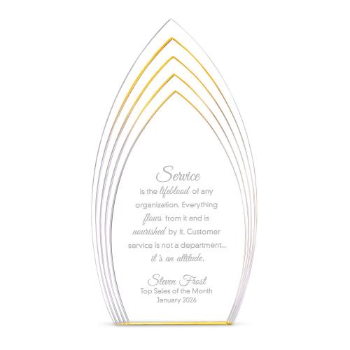 You and your team will love our Peak Strata Acrylic Award. The Peak Strata Acrylic Award stands out with its sleek, freestanding design and striking layered silhouette that draws the eye upward. Precision-cut arcs create a sense of movement and depth, while a vibrant color accent at the base reflects softly through the piece, adding a subtle, radiant glow. Available in gold, blue, and clear, this modern award offers a refined and distinctive way to recognize achievement.